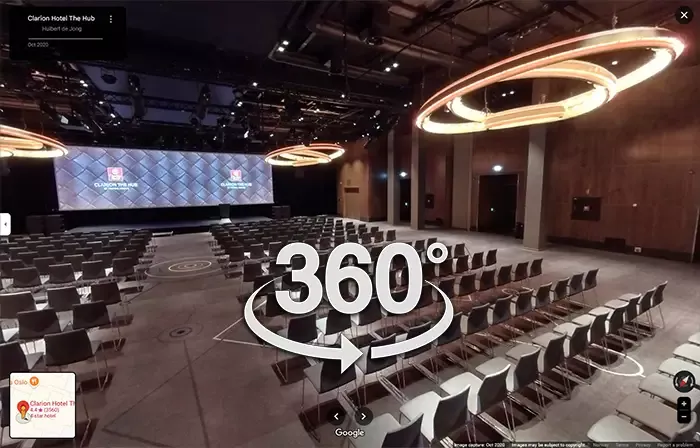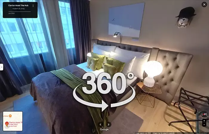 For example: I developed a custom 360/VR tour of Clarion Hotel The Hub in Oslo. This system shows 360 degrees views of all hotel rooms, the conference and meeting rooms and will offer much more additional information.
